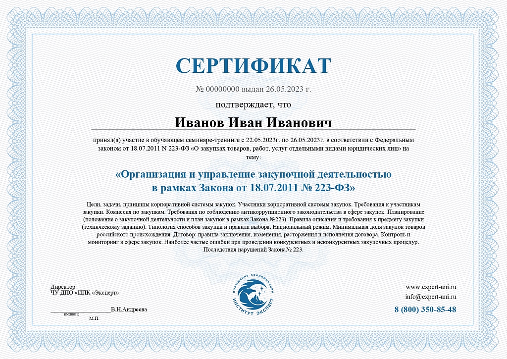 С выдачей Диплома о профессиональной переподготовке по 223-ФЗ с присвоением квалификации - Специалист /эксперт в сфере закупок: