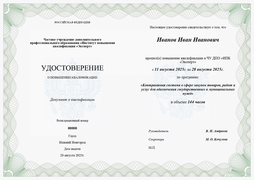 После повышения квалификации по курсу Вам выдается Удостоверение установленного образца. Это официальный документ, который подтверждает, что Вы прошли обучение на специальных курсах, освоили теоретические знания и практические навыки и подтвердили Вашу компетентность в работе.